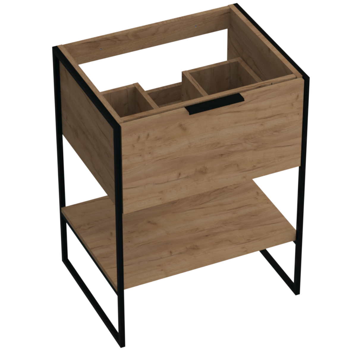 Szafka łazienkowa stojąca z kolekcji KOBE posiada metalowe nogi w stylu industrialnym. Wykonano je z wytrzymałego stelaża w czarnym matowym kolorze. Dzięki temu drewniane fronty rewelacyjnie wpasowują się w surowy klimat, wprowadzając do wnętrza łazienki trochę ciepła