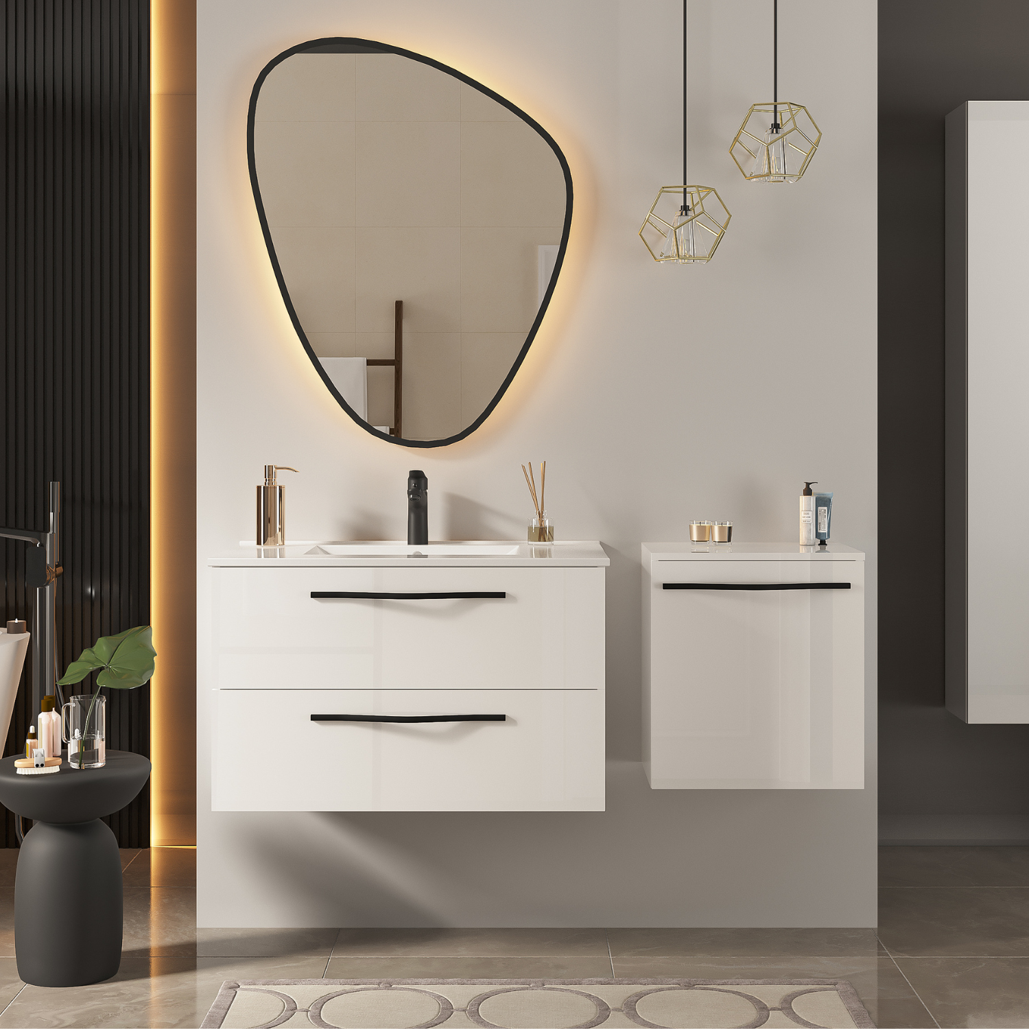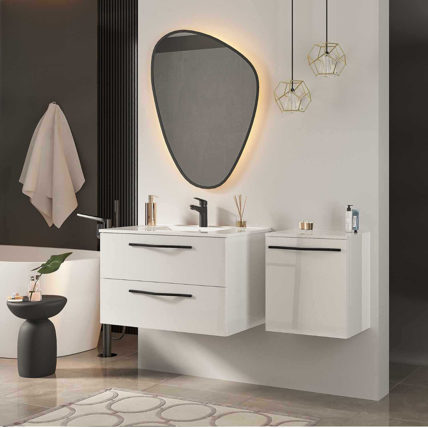 Szafka z umywalką 60 cm biały połysk PILAR z czarnym uchwytem