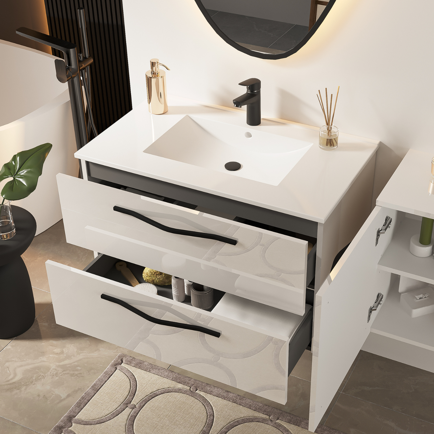 Szafka z umywalką PILAR 60 cm w białym połysku to nowoczesny mebel łazienkowy, który zapewnia styl i funkcjonalność. Front z MDF oraz korpus z płyty wiórowej wykończone są w białym połysku, co nadaje elegancji każdemu wnętrzu. Szafka posiada pojemną, dzieloną na trzy części szufladę z grafitowym wykończeniem wnętrza. Dodatkowo, wyposażona jest w czarny, metalowy uchwyt oraz system cichego domyku dla komfortu użytkowania.